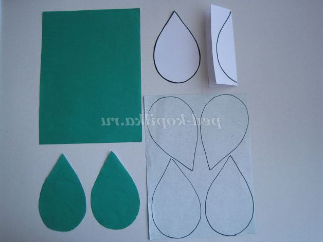 Приступаємо до виготовлення листя. Невеликий аркуш паперу скласти навпіл, намалювати половинку аркуша і вирізати. Це шаблон листочка. Беремо аркуш зеленого паперу, на звороті вимальовуємо шаблон і вирізаємо листя.