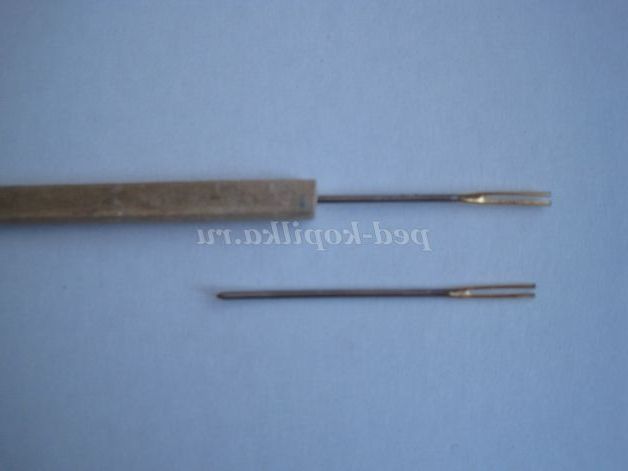 Беремо "циганську голку" (товста голка з великим вушком), кусачками відламати верхню частину вушка голки і вставити голку в дерев'яну ручку.