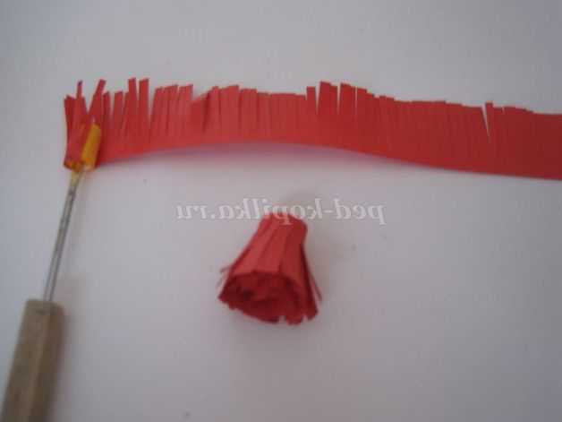 Спочатку скручуємо серединку квітки. Для цього беремо смужку шириною 0,5 см, протягуємо її в проріз інструменту для квілінгу і туго закручуємо, періодично підклеюючи середину смужки. Кінець смужки підклеюємо. Рол з інструменту не знімати.