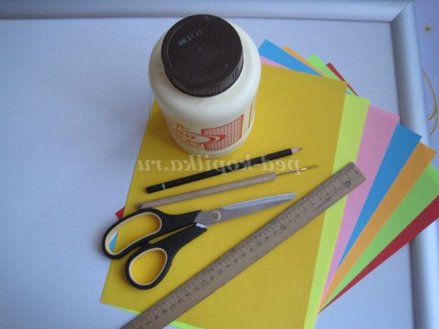 Приступаємо до виготовлення квітів. Для цього беремо аркуш кольорового двостороннього паперу для ксерокса, расчерчиваем його на смужки розміром 4 см, 3 см, 2 см, 0,5 див. Лист розрізаємо на смужки. Також чинимо з аркушами паперу іншого кольору.