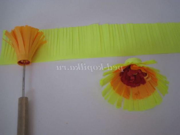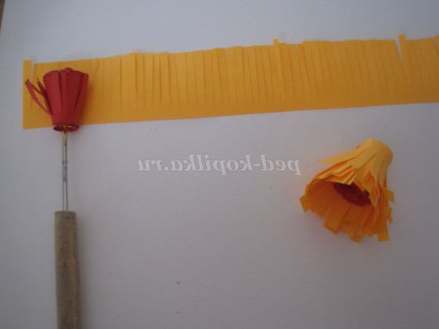 Смужки (4 см, 3 см, 2 см) з одного боку ріжемо соломкою, від краю залишаємо кілька міліметрів. Чим вже соломка, тим витонченіше квітка.