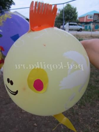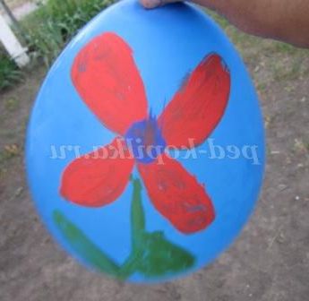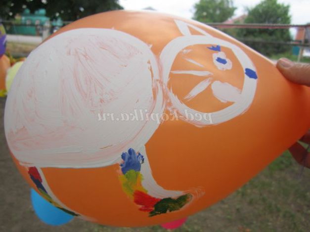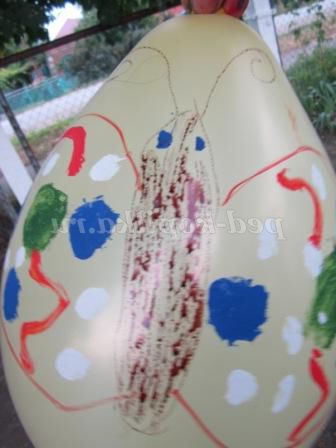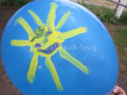 Ось в один з таких днів ми зайнялися розписом повітряних куль. Переглянувши доступний матеріал в інтернеті, я вирішила запропонувати дітям гуашевую фарбу (додала в неї кілька крапель миючого засобу для посуду), печатки, кисті, олівці. Кожна дитина сам вибирав тему і матеріал для свого малюнка. Хочу сказати, що фломастери залишали після себе дуже бліденький слід.