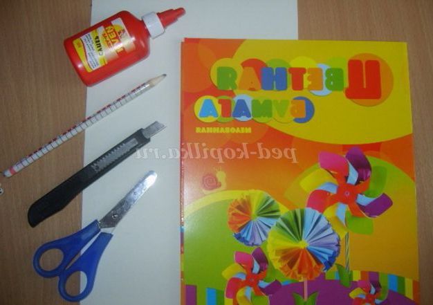 Збираємо квіточки. Ножицями акуратно загнути кожна пелюстка для обсягу. Наклеїти на велику квітку, маленька квіточка, потім наклеїти серединку.