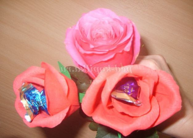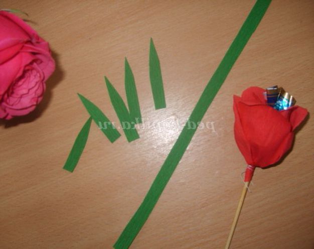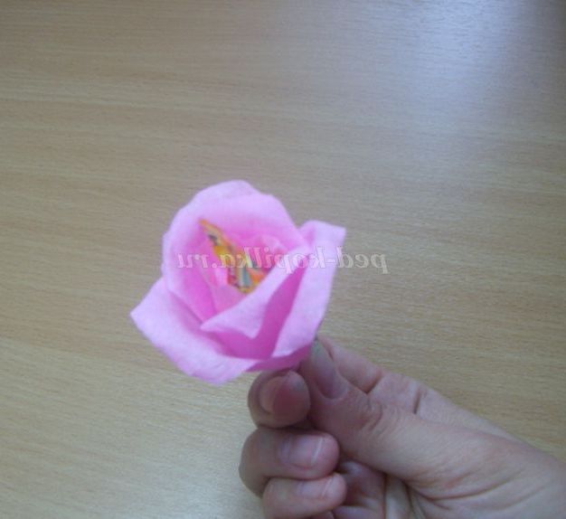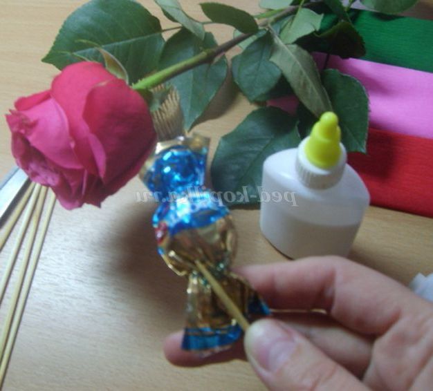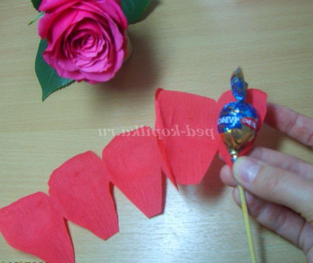 Таким же способом зробити квіти з рожевої гофри, на цукерки розміром поменше (розмір смужки 5x15 сантиметрів, прикріплювати на зубочистки).