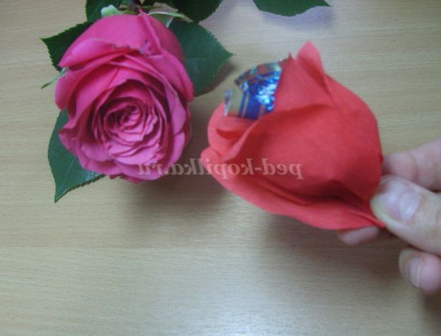 Акуратно розтягнути серединку кожної пелюстки для того, щоб вони добре лягли обернувши цукерку.