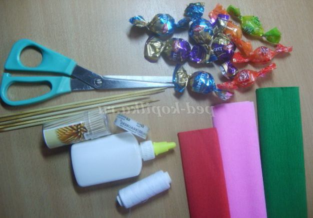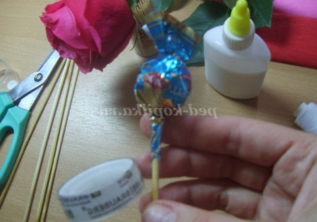 Для початку підготуємо цукерки. Розгорнути один край обгортки, вкласти шпажку і закрутити як було, закріпити цукерку з допомогою скотча.