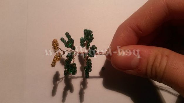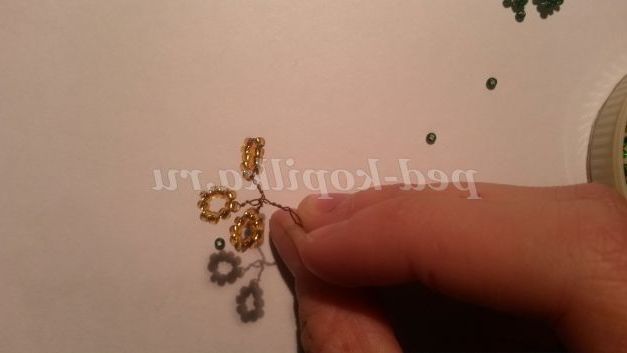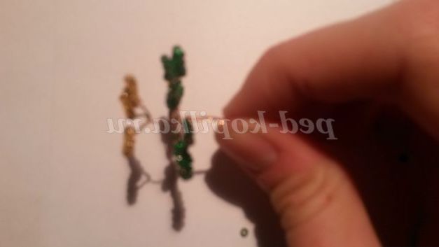 4) Основою кожної гілки буде ця ж конструкція, але з золотистого бісеру. До неї ми прикручуємо різну кількість рядів, в залежності від яруса, що складаються з 3-х голок.
