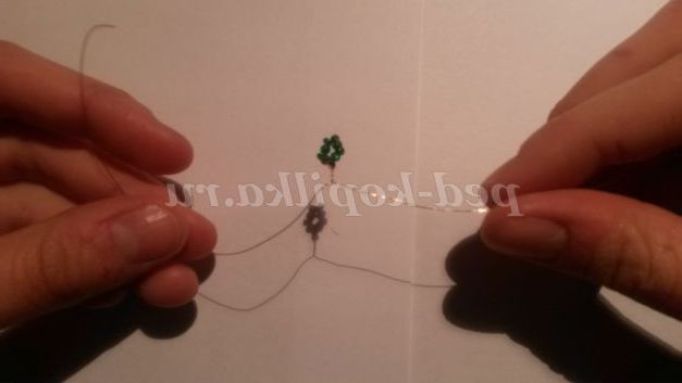 3) Далі роз'єднуємо ці краї і на кожен нанизуємо по 9 бисеренок. Проробляємо за попередньою схемою до одержання ось такий конструкції(для розуміння назвемо її голкою). Саме з таких голок ми і будемо виготовляти нашу ялинку.