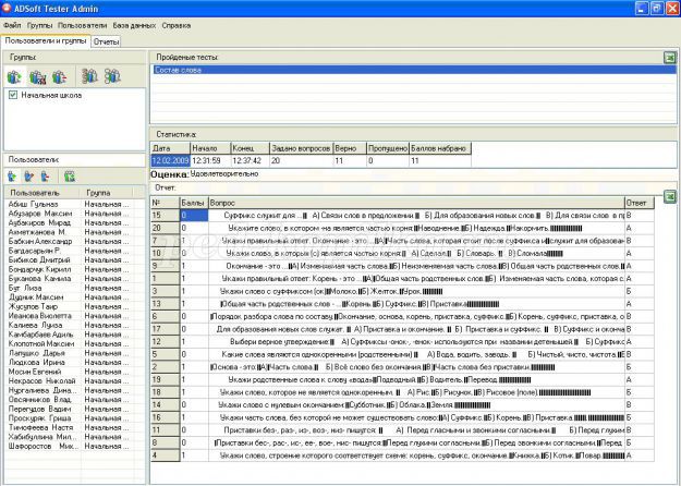 4. Ведеться облік роботи кожного учня з тестом: враховується номер спроби тестування (повторна спроба пройти тестування блокується), дата, час, пройдений тест повністю (і скільки правильних відповідей). Подібна статистика дозволяє уникнути конфліктних ситуацій з учнями.