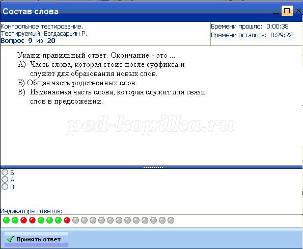 З 500 питань по російській мові, що знаходяться в тестері, програма методом ротації вибирає для учня 20 питань, які містять 3 варіанти відповіді, що виключає механічне запам'ятовування. В процесі тестування учня на екрані монітора постійно видається інформація про час, що залишився до кінця здачі тесту.