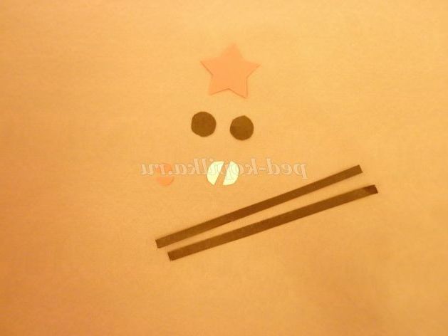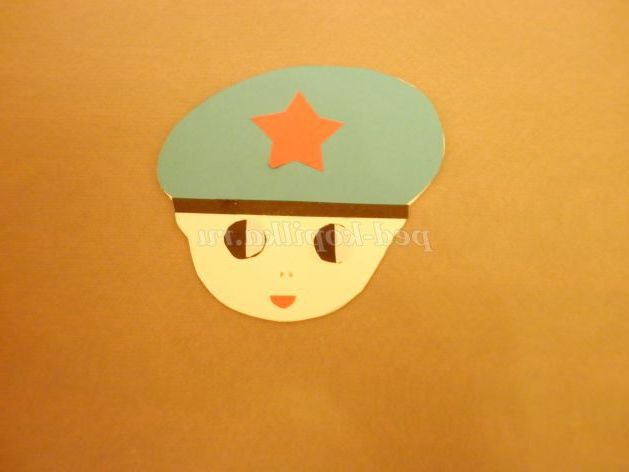 5. Оформляємо особа. На деталь голови білого кольору приклеїти синій берет і зірочку. Потім приклеїти кола чорного кольору, на них - напівкола білого кольору. Приклеїти маленький червоний півколо - рот. Залишилося намалювати ніс. На бере приклеїти чорну смужку і зірочку.