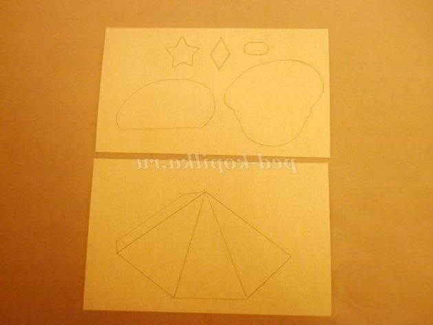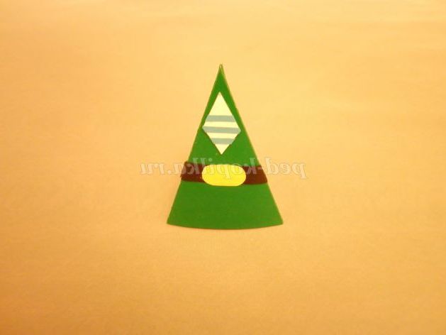 7. На картон зеленого кольору докласти шаблон тулуба і вырезать.С зворотного боку заготовки прокреслити кінчиками ножиць по лініях згину (так легше буде скласти) і склеїти піраміду.