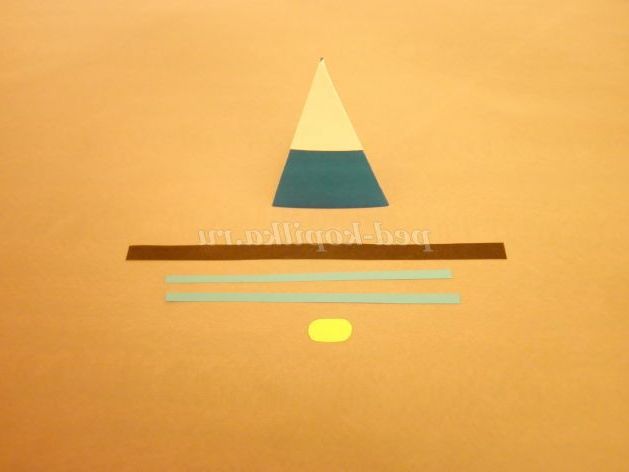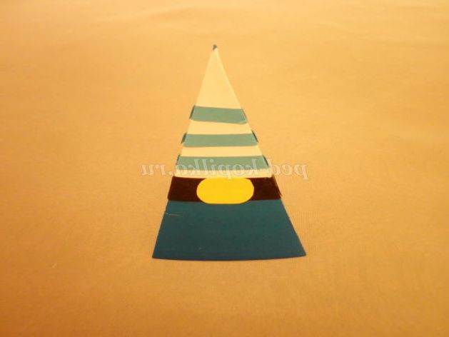 9. Вирізати з синього паперу вузькі смужки для тільники. З паперу чорного кольору вирізати смужку шириною 1 см. З паперу жовтого кольору вирізати пряжку. Всі деталі приклеїти на піраміду.