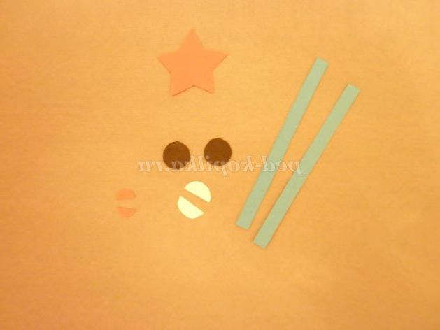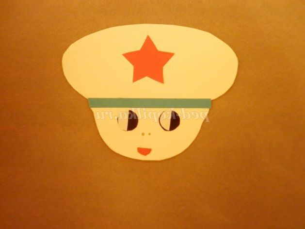 5. Оформляємо особа. На деталь голови білого кольору приклеїти кола чорного кольору, на них - напівкола білого кольору. Приклеїти маленький червоний півколо - рот. Намалювати ніс. Потім приклеїти блакитну смужку і вирізану червону зірочку.