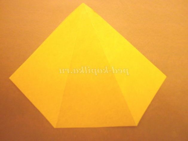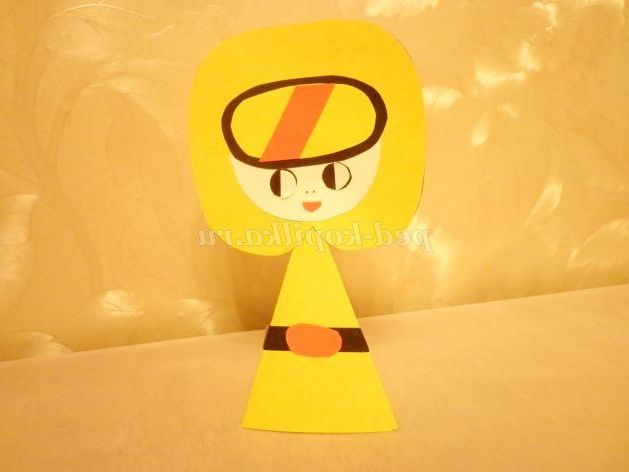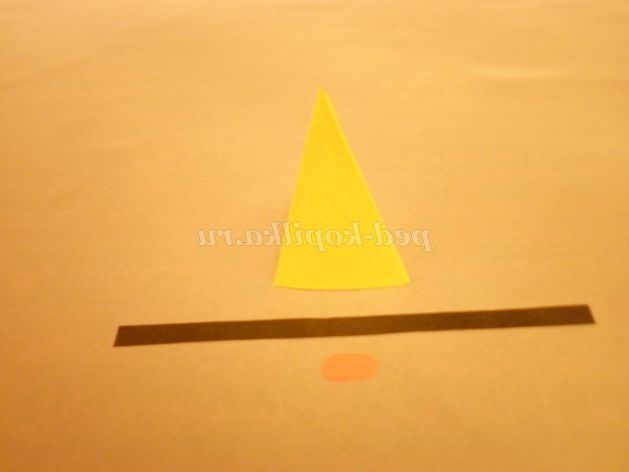 7. На картон жовтого кольору докласти шаблон тулуба і вирізати. Із зворотного боку заготовки прокреслити кінчиками ножиць по лініях згину (так легше буде скласти) і склеїти піраміду.