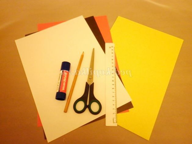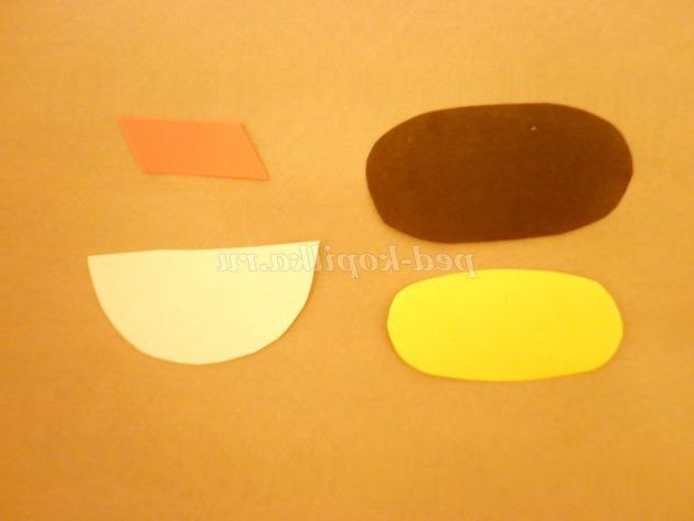 3. З паперу чорного кольору вирізати великий овал - узлісся. Потім з паперу жовтого кольору вирізати овал поменше. З білого паперу вирізати обличчя, а з червоного паперу чотирикутник для шапки.