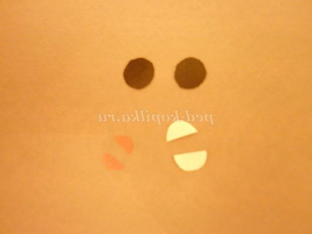 6. Оформляємо особа. Приклеїти кола чорного кольору, на них - напівкола білого кольору. Приклеїти маленький червоний півколо - рот. Залишилося намалювати ніс. Дві деталі голови склеїти.