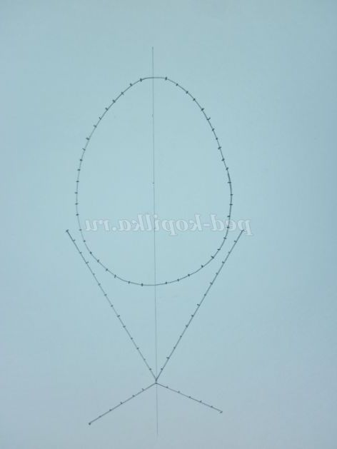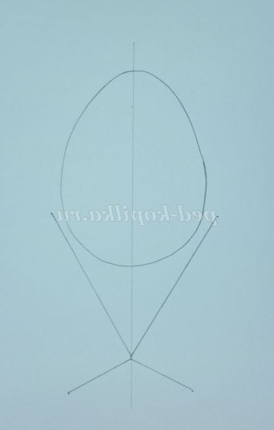 1. На аркуш білого картону з виворітного боку наносимо малюнок, попередньо розділивши аркуш на 2 рівні половини. Малюємо один гострий кут зі стороною, рівною 7 див., інший - тупий кут, зі стороною, рівною 3 див. При цьому можна використовувати трафарет. Малюємо овал, в довжину 8 см, в ширину - 6 див.