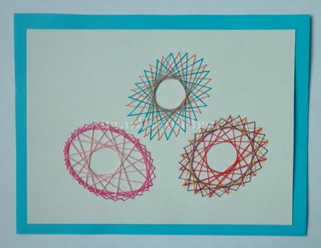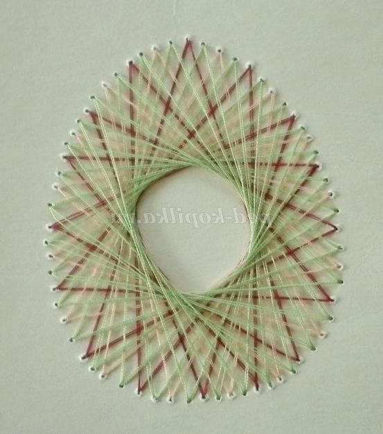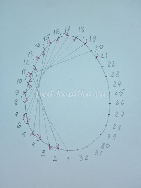 6. Тепер приступимо до вишивання овалу. Величина вишитого овалу залежить від довжини хорди - лінії між двома точками: чим коротше хорда, тим більше внутрішній коло, тим вже облямівка овалу. (Задане на початку роботи число отворів треба запам'ятати, щоб потім, коли треба буде замінити нитку, по заданому числу відновити її).