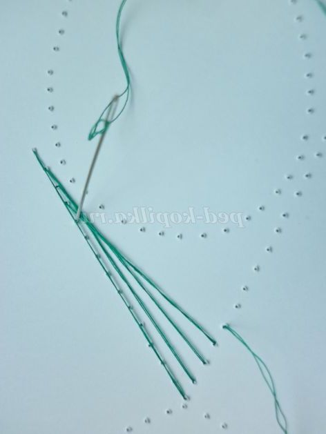 З отвору 3 виведемо голку на лицьову сторону в отвір 12 і т.д. по колу (з вивороту з отвору 12-13 на лицьову сторону 13-4, з вивороту 4-5, з лицьового 5-14, з вивороту 14-15, з лицьового 15-6, з вивороту 6-7, з лицьового 7-16 тощо).