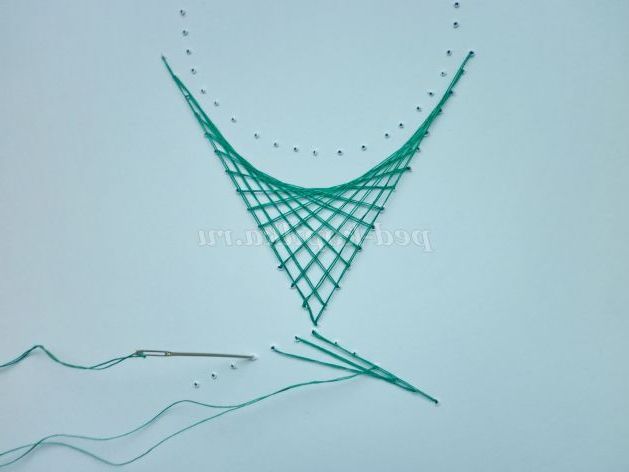 З виворітного боку в отвір 1 вводимо голку з ниткою. З лицьового боку направляємо голку у вершину кута, в отвір 8. З виворітного боку вводимо голку в другу отвір (7) від вершини правої сторони кута, з лицьового боку вводимо голку в другу отвір внизу зліва (9). З виворітного боку, з другого нижнього отвору лівого боку вводимо голку в третє знизу отвір лівого боку (10), на лицьовій стороні з третього нижнього лівого отвори направляємо голку в третє зверху отвір на правій стороні (6) і т.д.
