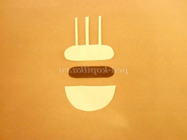 5. На одну деталь голови приклеїти особа, білу деталь з смужками. Зайві смужки обрізати по контуру. На цю деталь приклеїти овал чорного кольору.