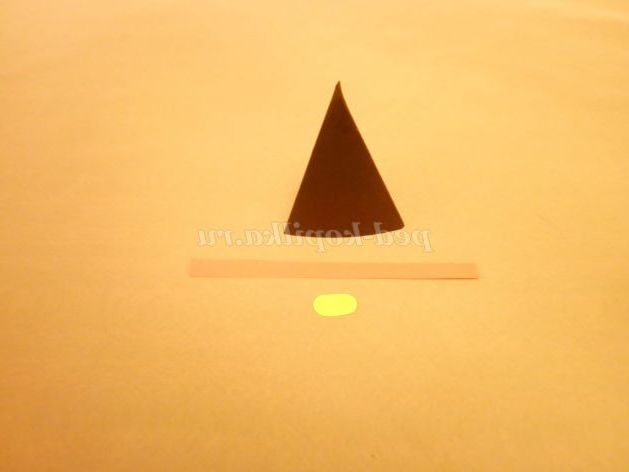 8. З паперу червоного кольору вирізати смужку шириною 1 см для ременя. З паперу жовтого кольору вирізати пряжку. Всі деталі приклеїти на піраміду.