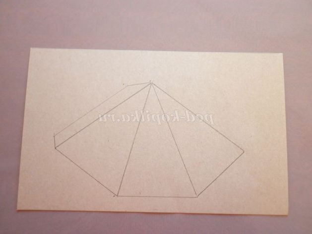 7. На картон чорного кольору докласти шаблон тулуба і вирізати. Із зворотного боку заготовки прокреслити кінчиками ножиць по лініях згину (так легше буде скласти) і склеїти піраміду.