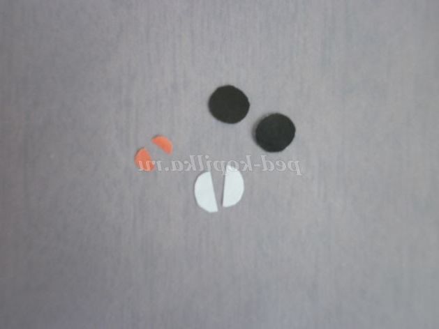 4. Для оформлення особи вирізати з паперу чорного кольору 2 кола, діаметром 12 мм З паперу білого кольору 1 коло, діаметром 12 мм, Потім розрізати його навпіл. Це будуть очі. З паперу червоного кольору вирізати коло, діаметром 6 мм, який теж треба розрізати навпіл. Це буде рот.