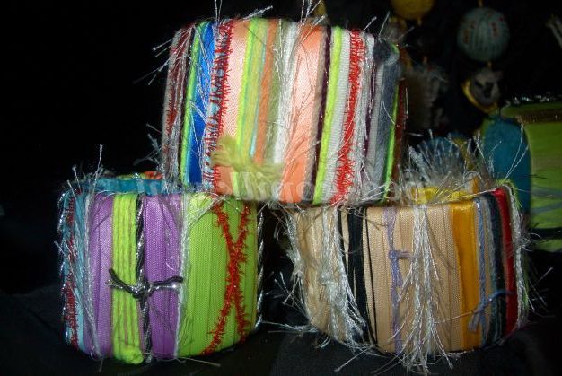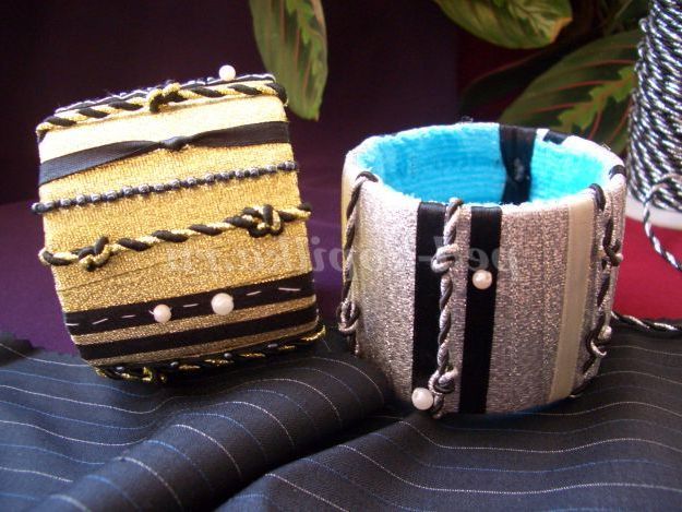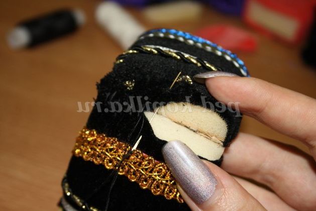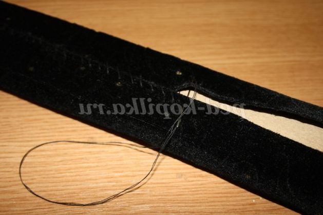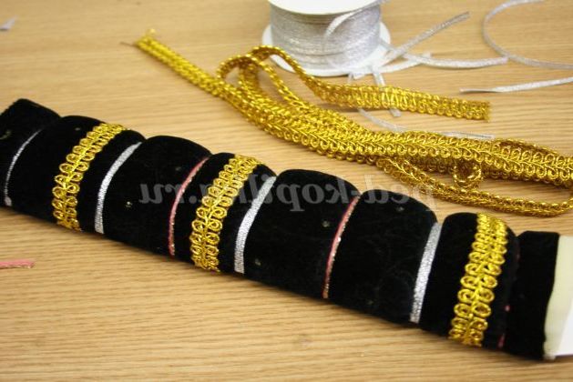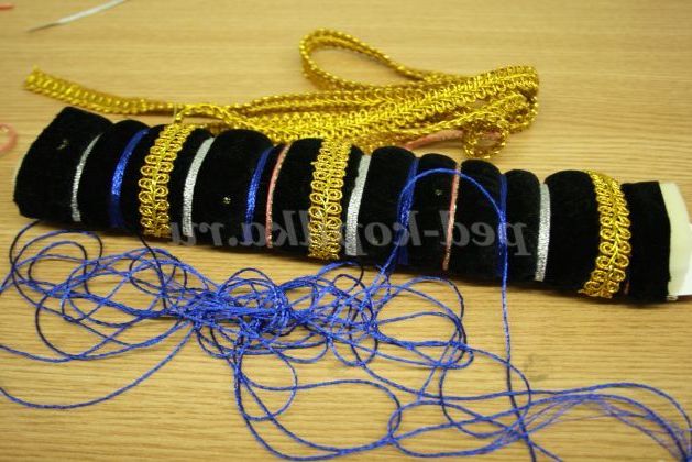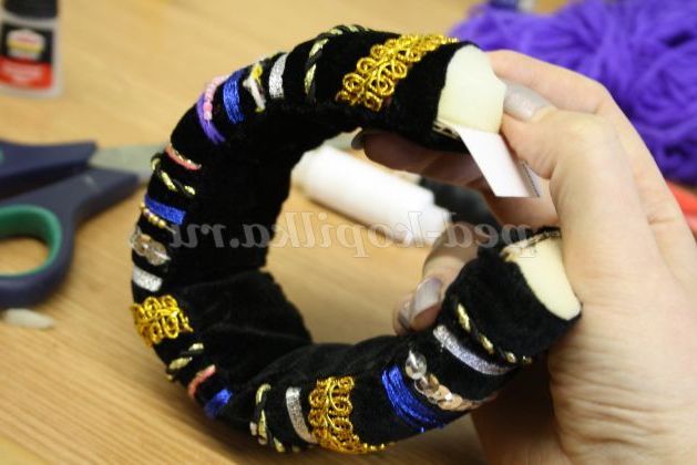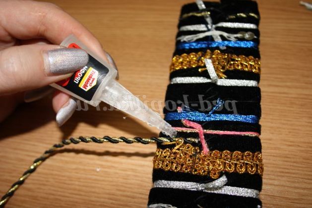 12) Коли браслет повністю прикрашений необхідно всі вузлики приховати. Для цього потрібно вирізати смужки з тканини товщиною 5 см, і пришити її до браслету з виворітного боку.