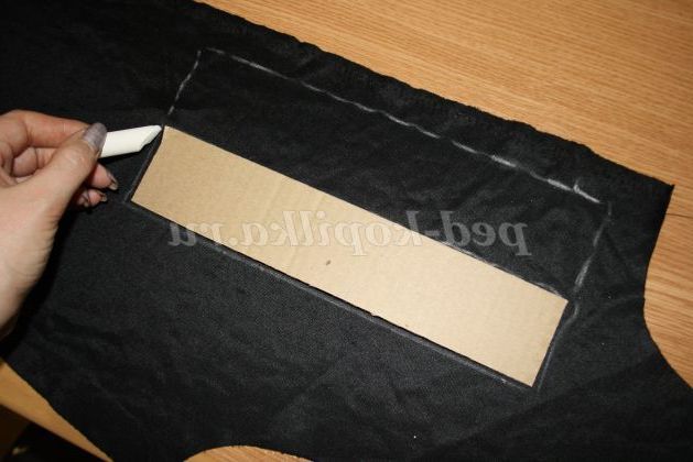 1) На картоні креслимо смугу шириною 5 см, а довжина залежить від обсягу вашої кисті. Вирізавши смугу, обводимо її на тканини так, як показано на рисунку.