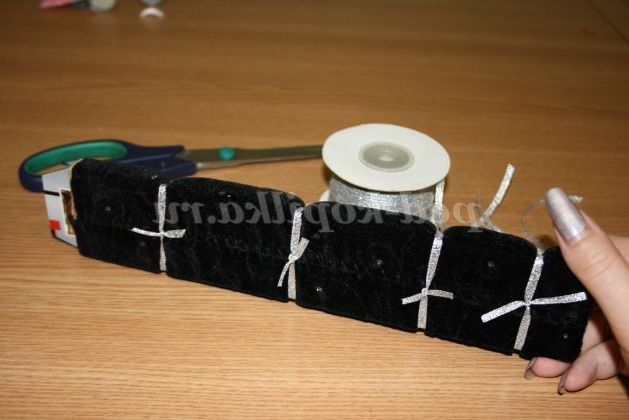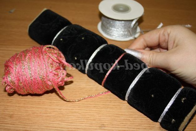 6) Беремо срібну стрічку і прив'язуємо до нашого браслету в декількох місцях. Всі бантики і вузлики повинні залишитися з виворітного боку.