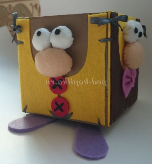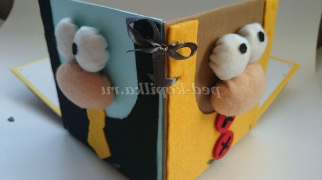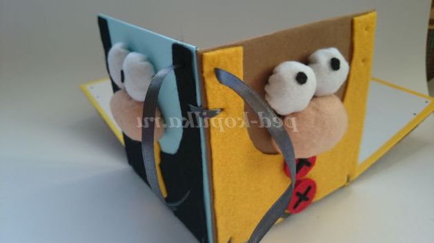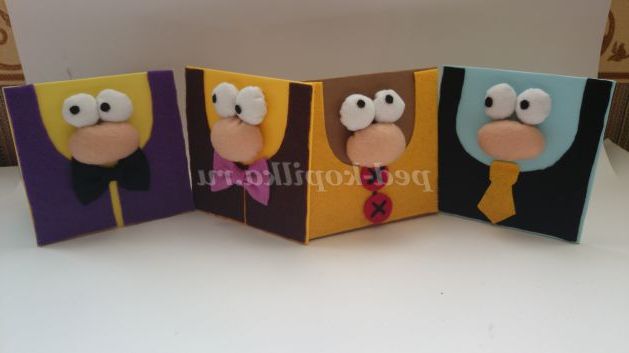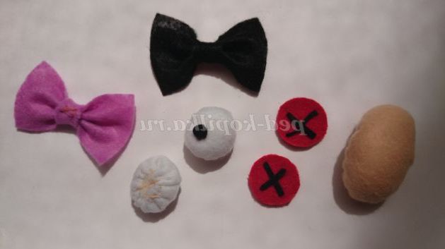6) Носики готові. На очі можна вирізати з чорного фетру зіниці і приклеїти на клей Момент. Гудзики можна прикрасити, приклеївши смужки фетру або вручну намітати нитками. Бантик (з двох частин) 1 частина збираємо на голку посередині і пришиваємо 2 частина тоненьку смужку зверху.