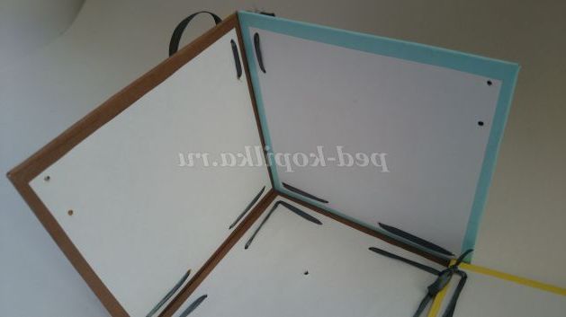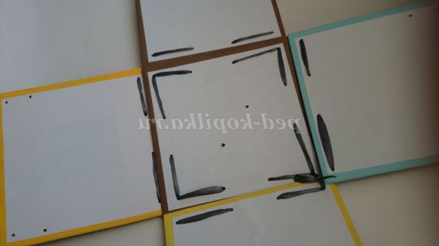 1) Вирізуємо 5 квадратів з картону 12*12см. Приклеюємо їх клеєм олівець-тонований папір залишаючи по краях (2-3 см) місце для загину. Потім відрізаємо куточки папери і приклеюємо краю до картону.