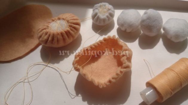 5) Шаблони носиків і очей у нас будуть об'ємними. Тому нанизуємо краю деталей на тонку голку з ниткою, злегка затягуємо, набиваємо синтепоном , затягуємо сильніше.