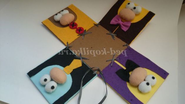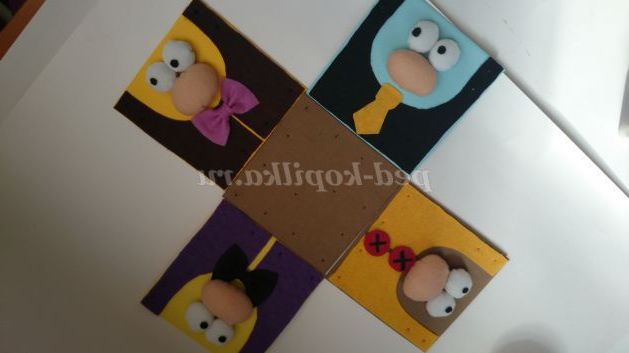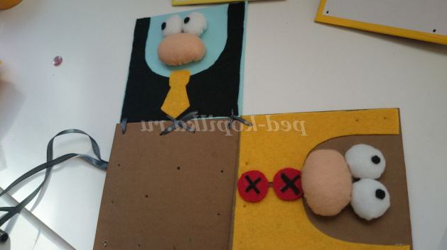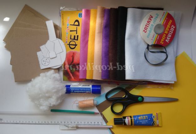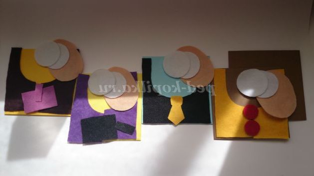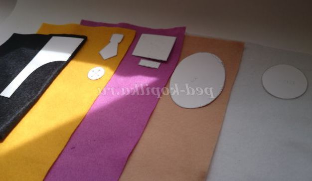 3) Розкладаємо вирізані шаблони на фетр. Намагайтеся підбирати кольори по природніше. Наприклад: очі-білого кольору, ніс - тілесного або червоного кольору...