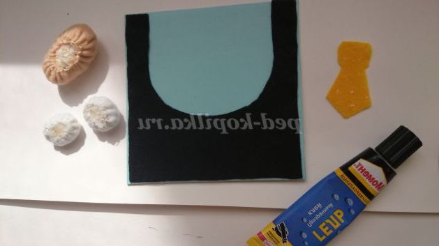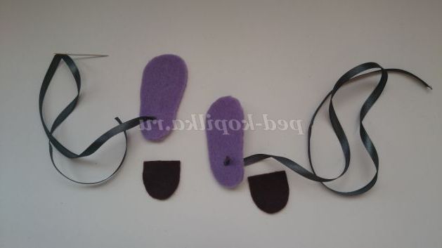 15) Вирізаємо з фетру підошву для ніг. Протягуємо на п'ятачку стрічку, зав'язуємо у вузлик і заклеюємо вузлик каблучком.