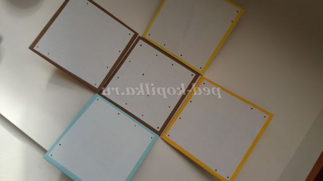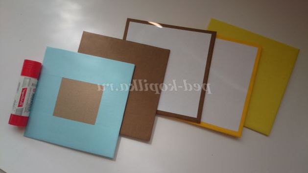 2) Вирізаємо з білого паперу 5 квадратів менше (11*11см) і наклеюємо на наші готові кольорові квадрати з виворітного боку. Так ми приховаємо всі нерівності.