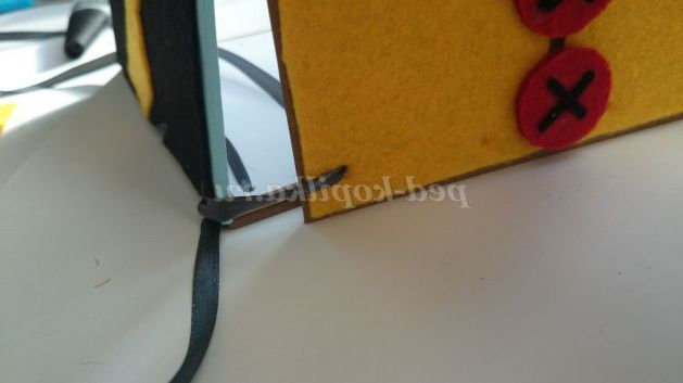 13) Відрізаємо чотири стрічки довжиною по 40см. Піднімаємо наші бічні сторони. На верхній частині по два отвори. Протягуємо в нижні отвори першу стрічку, як показано на фото.