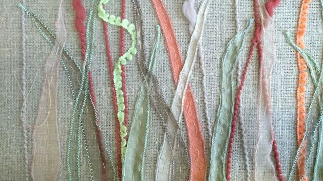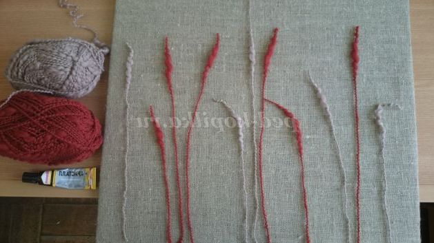 6) Починаємо складати нашу картину. Клеєм Момент приклеюємо до основі з мішковини пряжу різних відтінків і форм.