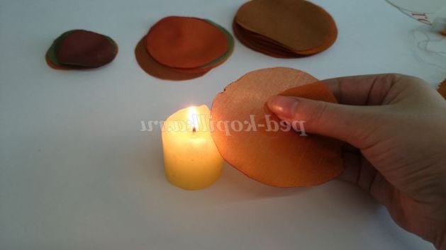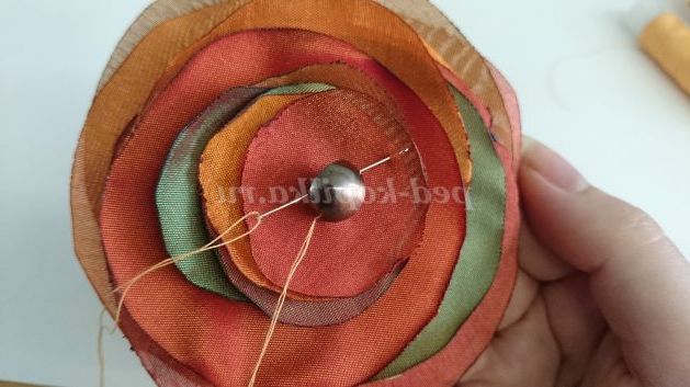 Прошиваємо краю квітки на машинці швом «зигзаг» і вирізаємо по краю. Серединку з кружечків обпалюємо свічок і збираємо в маленький квітка.