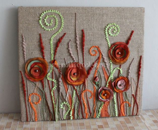 8) Далі можна наклеїти в декількох місцях (порожні місця будуть видні) ще пряжу. Розподіляємо квіти по всій поверхні панно і пришиваємо.