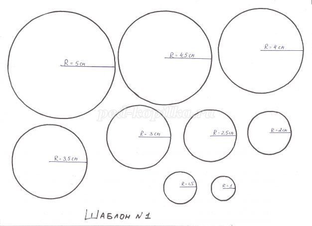 1) Для того, щоб вийшло яскраве і цікаве панно нам необхідно підготувати окремі деталі і прикраси. Спочатку вирізаємо кілька гуртків з різної тканини різного розміру (шаблон №1).