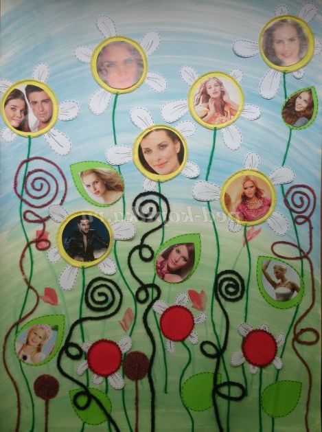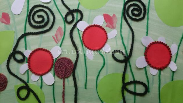 9) Можна спробувати докласти наші фотографії і подивитися, як все буде виглядати. Фото вирізаємо у вигляді гуртків і листочків. Нашим квітам не вистачає яскравості. Приклеюємо чорну і бордову пряжу на клей Момент у формі завитків.