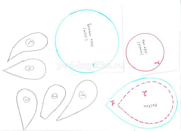 3) З тонованою папери вирізаємо деталі для квітів (7 великих жовтих кружечків, 3 маленьких червоних гуртка, 8 листочків і на кожен гурток з 5-6 білих пелюсток).