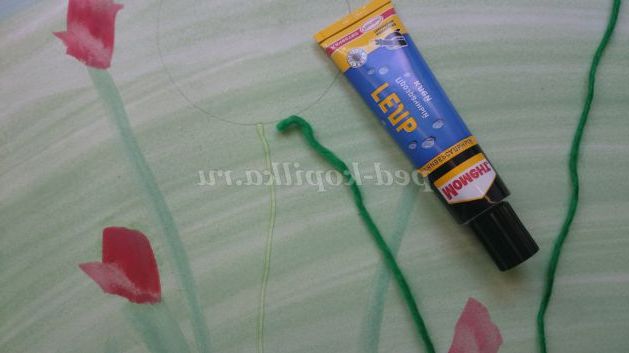 5) Можна візуально, можна провести олівцем від гуртків стеблинки. Наносимо клей Момент і приклеюємо зелену пряжу.