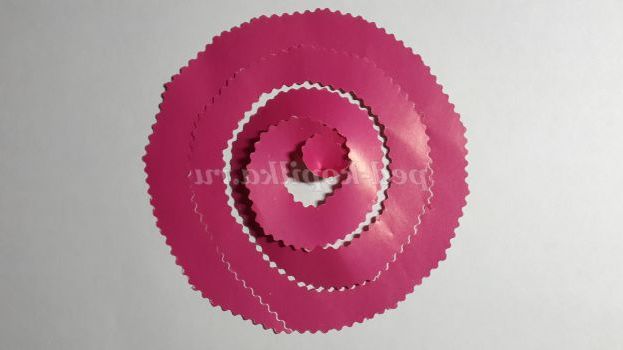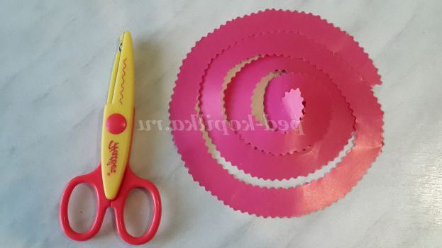 - Вирізаємо коло з кольоровий двосторонній крейдованого паперу червоного кольору, використовуючи шаблон, ножицями з хвилястими краями. На ньому намічаємо олівцем лінії у вигляді спіралі, як показано на шаблоні і вирізаємо.