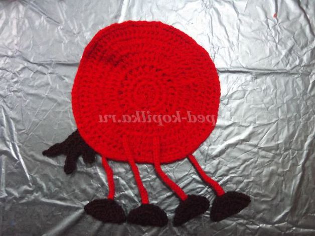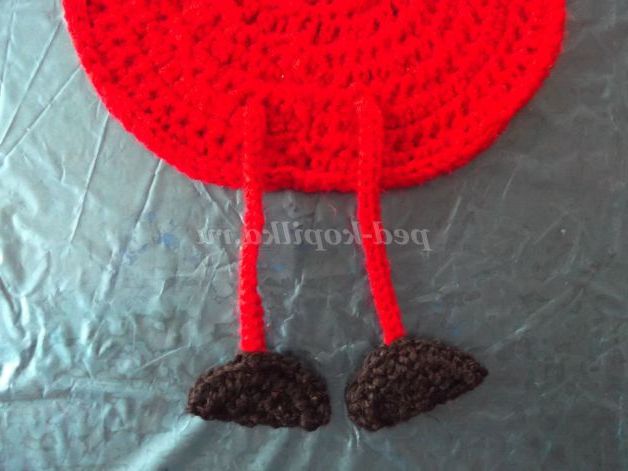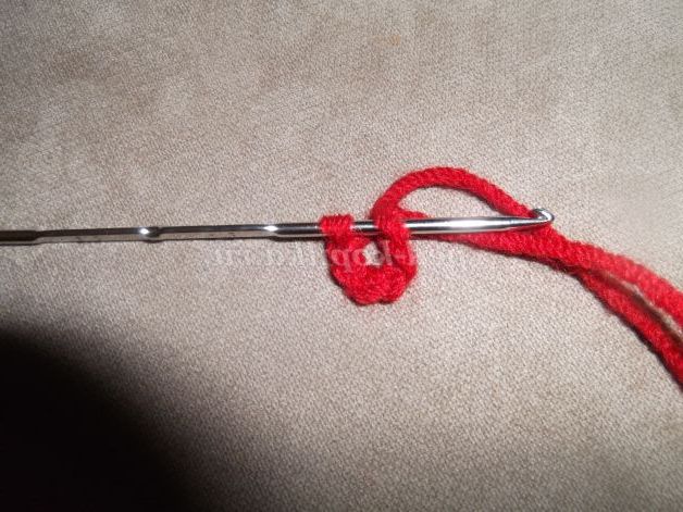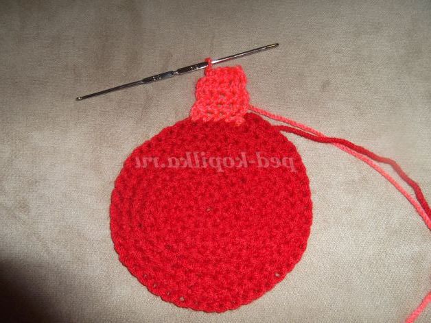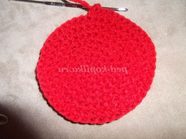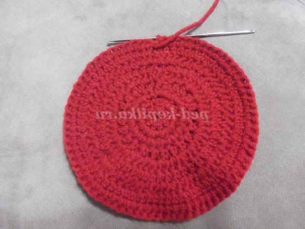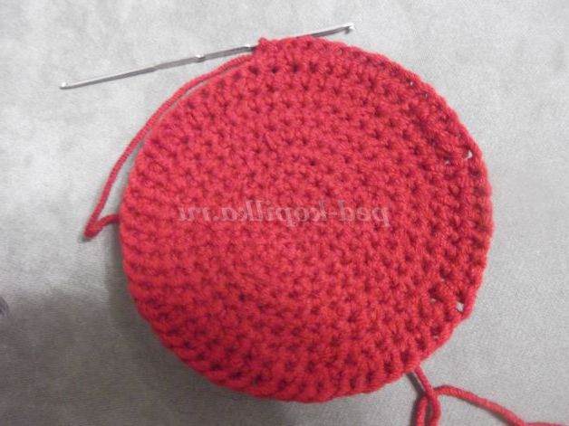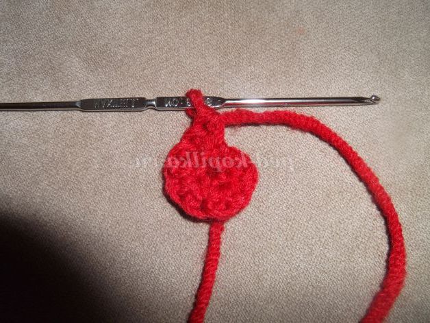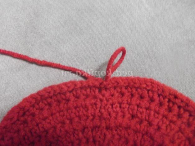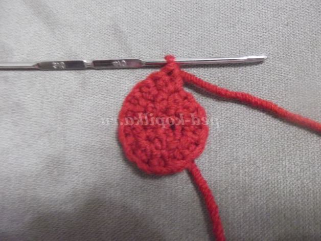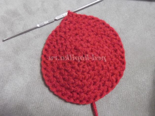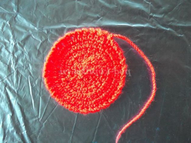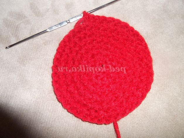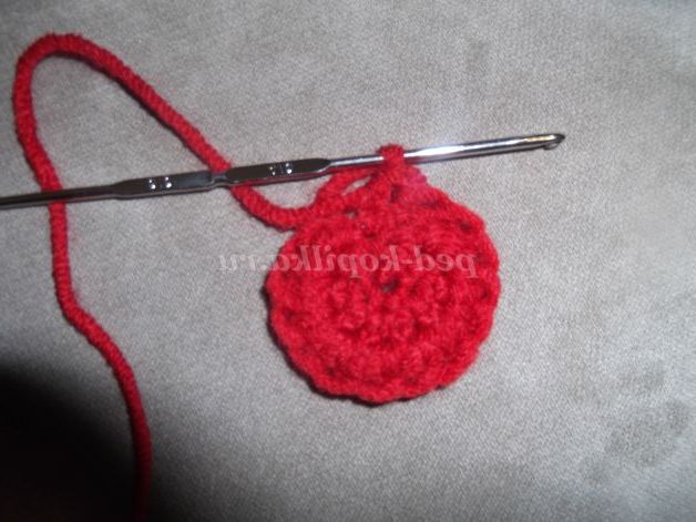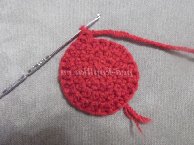 Наберіть пряжею бордового кольору 6 в.п. Замкнути ланцюжок в кільце за допомогою соед. ст.и в'яжіть по колу: