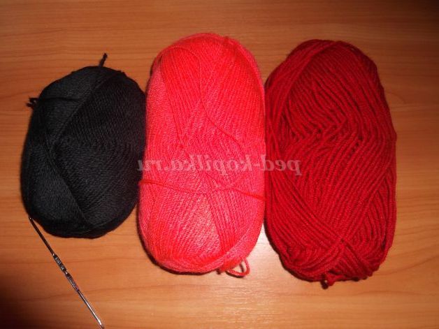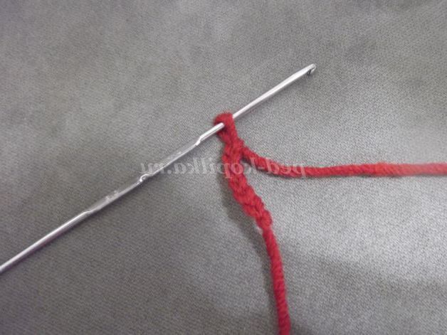 Наберіть пряжею бордового кольору 23 в.п., пропустіть 1 петлю і провяжите 22 ст.б/н Перервіть нитку, залишивши довгий кінець