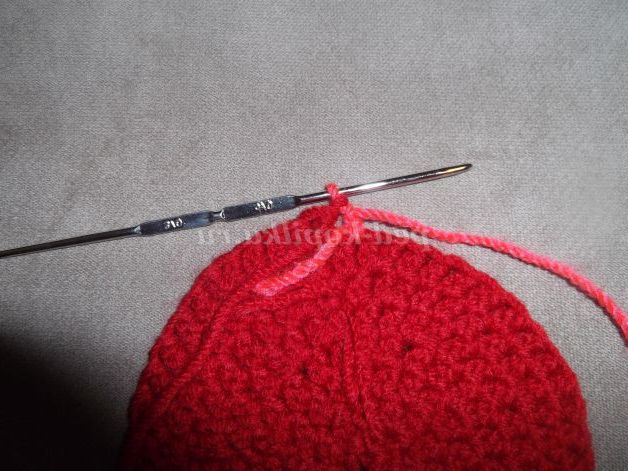 Наберіть пряжею рожевого кольору 6 в.п. Замкнути ланцюжок в кільце за допомогою соед.ст. і в'яжіть по колу: